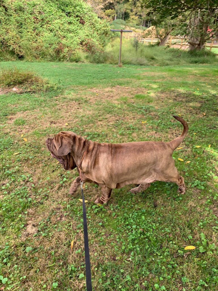 General Appearance: rectangular in shape, massive, powerful. Head and body covered with loose skin. Head has many wrinkles and folds, thick loose pendulous jowls. Huge bone. Long tail, scissor or level bite, nose big, nostrils well open and colour of body coat, ears cropped or hanging natural, lower lid of eyes will droop , Size males 25.5- 29.5in and about 150 lbs females 23.5-26.75 in and about 130 lbs